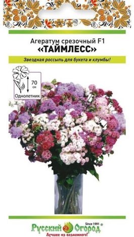 Агератум Таймлесс срезочный – это необыкновенная смесь высокорослых сортов агератума самых разных расцветок! Агератум любит обрезку и формовку, достаточно быстро растёт после них. При этом куда более пышно. Также цветение становится обильнее, ведь появляются дополнительные побеги с цветочными почками. Агератум следует посадить на рассаду в начале апреля. Поверхностно, под пленку или же стекло. Всходы появляются быстро, после появления 3 настоящих листочков проведите пикировку. Высадку производите в конце мая или начале июня. Постарайтесь оставить хотя бы 10 см между растениями, чтобы они хорошо разрастались. В середине осени, уже после цветения, вы можете выкопать корневища агератумов и пересадить в горшки, оставив в прохладном месте (не с минусовой температурой!). Весной можете их высадить, чтобы высота Таймлесс F1 увеличилась, да и ширина растения стала больше!