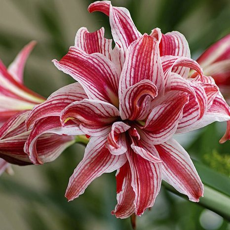 Амариллис Дублет (Amaryllis Doublet) Изумительный сорт! Высота растения 45 см. Необычное растение с махровыми цветами! Лепестки узкие и вытянутые, расцветка изящно-полосатая, цветки до 20см в диаметре, в соцветии не менее трех.