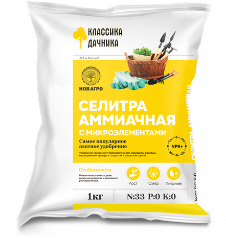 N:P:K 33:0:0. Аммиачная селитра является самым популярным азотным удобрением. Его внесение способствует здоровому росту стеблей и листьев, делает цветение более долгим, положительно сказывается на качестве и количестве урожая. Удобрение применяют повсеместно для подкормки рассады, выращивания культур в открытом и закрытом грунте. Использовать нитрат аммония можно даже во время развития или активного роста растения.