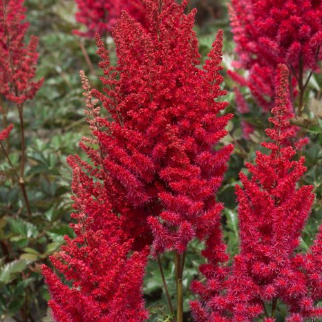Астильба Ред Скайкрепер (Astilbe chinensis Red Skycraper) Цветки яркие, вишнёво-красные. Соцветия пушистые. Цветение в июле-августе. Листва зелёная, блестящая, пышная. Цветоносы прочные, высотой 60-70 см. Длительный период цветения