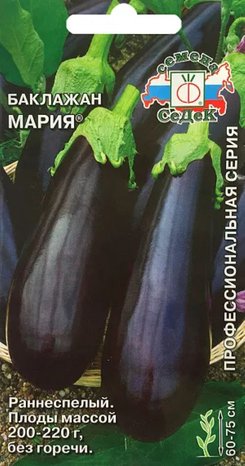 Раннеспелый (95-100 дней) сорт для открытого грунта, пленочных теплиц и укрытий. Растение высотой 60-75см. Плоды выравненные, цилиндрические, темно-фиолетовые, массой 200-220г. Мякоть белая, плотная, без горечи. Урожайность под пленочными укрытиями 4.9 кг/кв.м. Ценность сорта: устойчивость к заболеваниям и перепадам температуры, стабильно высокая урожайность. Рекомендуется для всех видов кулинарной переработки.