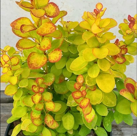 Листья яркие, почти флоуресцентные, весной оранжево-красные, летом ярко-жёлтые, не чувствительные к солнечным ожогам. Осенняя окраска огненная. Молодые побеги весной ярко-оранжевые. Цветки мелкие жёлтые. Цветение в мае. В августе созревают ярко-красные ягоды. Побеги колючие. Годовой прирост 8 см. Куст плотный, компактный, колонновидный, к 10-ти годам высота 80 см и ширина 40 см. Место солнечное. Почва дренированная, умеренно влажная. Морозостойкость до -27ºС.
