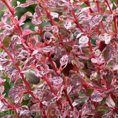 Барбарис тунберга Розетта – невысокий сорт шаровидной формы, не высокий, вырастающий в высоту не более 1.5 м. Ветки изящные, тонкие, изогнутые к земле, имеют мелкие, острые, одиночные колючки. Молодые листья цельнокрайние, ярко-пурпурной окраски, с розово-серыми и мраморными бронзово-красными разводами.