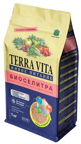 "TERRA VITA БИОСЕЛИТРА - азотное удобрение с двойной формой азота и содержанием кальция (6%) для активного роста растений. Формула обеспечивает быстрый эффект роста и одновременно поддерживает растения на протяжении всего периода развития, укрепляя корневую систему и улучшая структуру почвы.