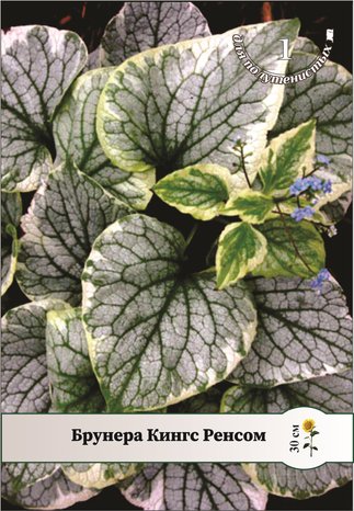 Брунера крупнолистная Кингс Ренсом (King's Ransom) Высота растения 30 см. Куст разрастается до 60 см. Листья серебристые, зелеными остаются лишь жилки и неровная кремовая кайма по краю листа. Цветки голубой окраски.