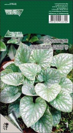 Бруннера крупнолистная Сильвер Вингс (Silver Wings)Высота растения 35-45 см. Куст разрастается до 40-50 см. Листья крупные, сердцевидной формы, слегка опушенные, зелёные с серебристыми пятнами и тонкой белой каймой по краю. Цветки голубой окраски.