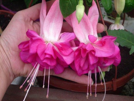 Серия с огромными махровыми цветами. Окраска чашелистников светло-розовая, лепестков - вишнево-красная. Мощный габитус.