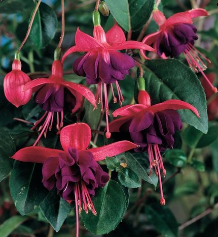 Красивая ампельная фуксия со средними по размеру махровыми цветками. Сильный рост, цветение раннее. Венчик бордовой окраски, чашелистики — красно-розовые. Подходит для выращивания в подвесных горшках.