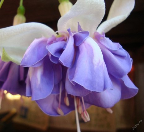 Сорт с крупными махровыми цветками. Окраска чашелистников белая, лепестков - фиолетовая. Мощный габитус.