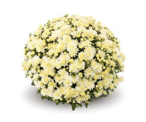 Хризатема-мультифлора: не требует формирования, образует компактный куст в форме шара. Высота до 50 см. Цветки диаметром 5,5 см, белой окраски. Начало цветения вторая половина августа