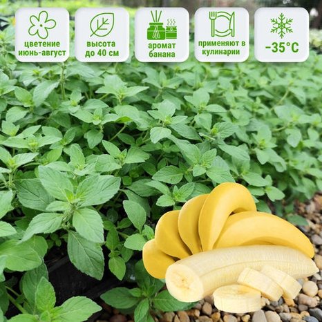 Уникальный сорт мяты с необычным фруктовым ароматом, сочетающим свежесть классической мяты с нотками спелого банана. Растение высотой 20–45 см, шириной 20–30 см.