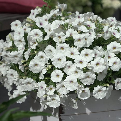 Гибрид петунии и калибрахоа. Сорт компактный. Отлично держит непогоду, выдерживает палящее солнце, плети не страдают от ветра, быстро восстанавливается после дождя, выдерживают заморозки до -5. Цветки среднего размера, белой окраски с бордовым окаймлением по центру.