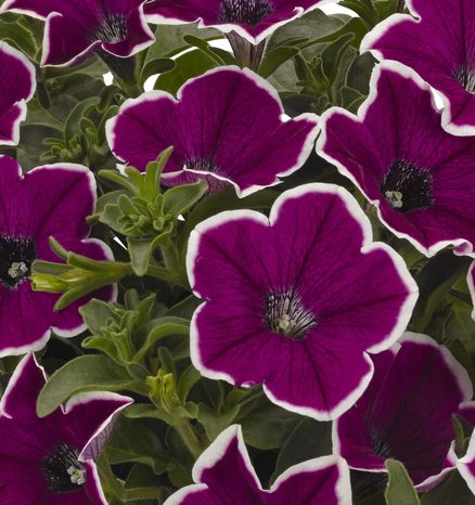 Каскадная петуния, образующая очень пышные, шарообразные шапки. Высота 40-50 см. Плотное, обильное цветение. Для крупных кашпо и вазонов. Цветки темной лиловой окраски с белой окантовкой.