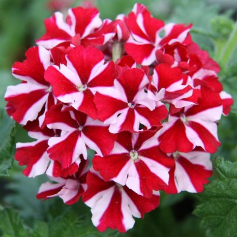 Красивое ампельное растение с крупными соцветиями. Высота растения 20-25 см. Диаметр соцветий 5-7 см. Цветки белой окраски с красными звездами. Прекрасно смотрится в бордюрах, цветниках, балконных ящиках