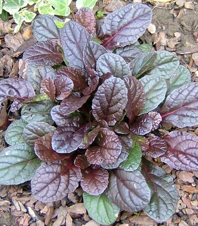 Многолетнее почвопокровное растение высотой 15-20 см. Листья необычного фиолетово-коричневого окраса, цветки темно-синие.