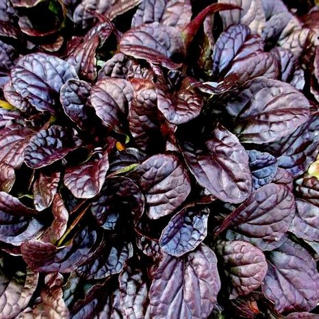 Очень красивое многолетнее почвопокровное растение высотой 10-15см. Листья округлые, красновато-пурпурные, черно-бордовые, глянцевые. Цветы синие.