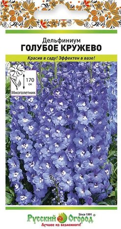Дельфиниум Голубое Кружево – идеальное растение для заднего фона цветника. Его крупные сине-голубые цветки с контрастным белым глазком собраны в плотные пирамидальные соцветия. Высота – больше 1,5 м. На лепестках часто возникает фиолетовый румянец, прожилки лепестков тёмно-синие.