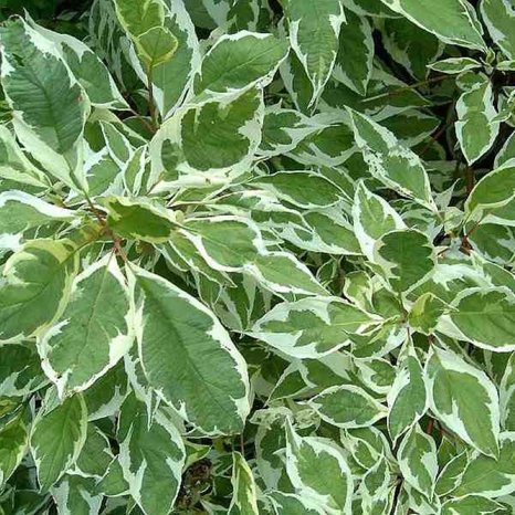 Компактный сорт с зелеными листьями с неровной бело-бежевой каймой. Высота и диаметр растения – 1,5 метра. Крона раскидистая, широкоокруглая. Побеги прямые, черные, со временем чуть наклоняются к земле. Темпы роста быстрые. Листья овальной формы с заостренными кончиками, без опушения. Оттенок светло-зеленый с неровной бело-бежевой каймой. Длина - 4-8 см. Цветет растение в июне в течение трех недель. Цветки маленькие, белые, собраны в щитковидные соцветия, неароматные. Ягоды несъедобные. При полном созревании цвет голубовато-розовый. Cчитается морозоустойчивым растением (до – 30 градусов).