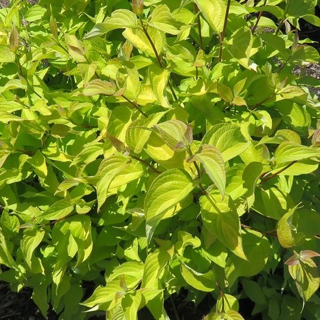 Дерен белый Неон Бёрст. Декоративный компактный куст высотой и шириной 120-150 см. Листья весной медно-бронзовые, летом от ярко-жёлтых до зеленовато-жёлтых, осенью имеют оттенки золотого, красного и тёмно-фиолетового, на полном солнце не выгорают. Побеги зимой очень эффектные, ярко-красные. Цветки маленькие белые, в верхушечных соцветиях. Цветение в мае-июне. Место солнечное. Почва влажная