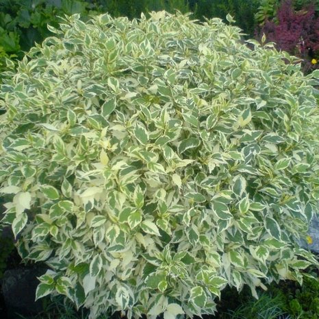 Дерен Сибирика Вариегата - декоративный, листопадный кустарник, отличающийся своей необычной окраской. Он неприхотлив и очень хорошо разрастается, достигая двухметровой высоты. Кора ветвей блестящая, красноватого оттенка. Листья эллиптические, заостренные, темно-зеленого цвета с кремово-белой каймой и небольшими пятнышками и полосками в центре листа. Осенью листья окрашиваются в коричнево-пурпурные цвета. Цветет обычно в мае-июне, не обильно, шаровидными, кремово-зеленоватыми соцветиями до 4-5 см. в диаметре. Плоды мелкие, круглые, сине-голубые с восковым налетом. Корневая система состоит из множества мелких и тонких корней, именно поэтому куст может быстро высохнуть в условиях жесткой засухи. В остальном дерен белый Sibirica Variegata (Сибирика Вариегата) одинаково хорошо переносит морозную зиму и жаркое лето. Долговечность кустарника – более 25 лет.