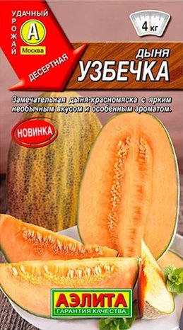 Новая, очень вкусная дыня с интенсивно окрашенной мякотью. Такие дыни называют красномясками и ценят за яркий цвет, необычный вкус и особенный аромат. Сорт среднеспелый, от всходов до созревания первых плодов 80-90 дней. Растения длинноплетистые, с хорошо развитым листовым аппаратом. Плоды овальные и удлиненно-овальные, массой 3-4 кг. Мякоть хрустящая, яркого розово-оранжевого оттенка. Цвет говорит о большом количестве бета-каротина – сильного антиоксиданта, эликсира долголетия, источника молодости. Во вкусе легко различается привкус ананаса, груши, земляники и ванили. Сорт идеально подходит для фруктовых салатов и других изысканных десертов