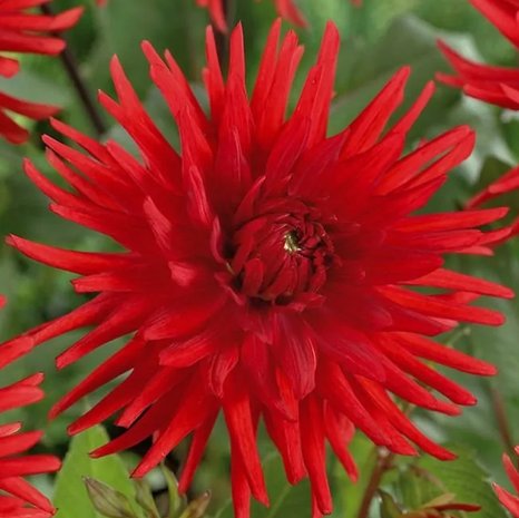 Георгин Бергерс Рекордс (Berger's Rekord) Кактусовый. Высота растения 90-110 см. Соцветия оранжево-красной окраски достигают диаметра 15-18 см. Лепестки свернуты в трубочку не более чем наполовину длины. Цветение наступает в августе.