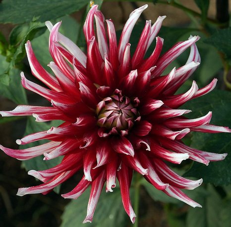 Кактусовый. Высота растения 140см. Соцветия густо-махровые, красные с белыми кончиками. Цветки достигают диаметра 15-18см. Лепестки свернуты в тонкую трубочку по всей длине. Цветение наступает в августе.