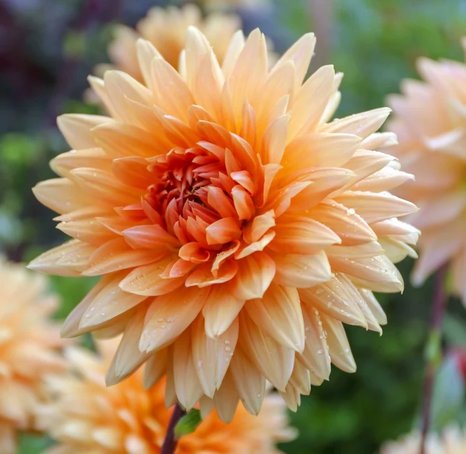 Георгин Нордвинг Глори (Noordwijks Glory) Декоративный. Высота растения 100-120 см. Соцветия густо-махровые с плоскими широкими, закругленными на концах лепестками золотисто-персиковой окраски, достигают диаметра 15-20 см. Цветение наступает в августе.