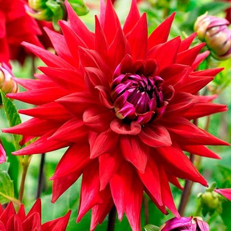 "Георгина Виттеманс Бест (Wittemans Best) Кактусовый. Высота растения 90-110 см. Соцветия густо-махровые, ярко красной окраски, достигают диаметра 15-20 см. Лепестки свернуты в трубочку не более чем наполовину длины. Цветение наступает в августе."