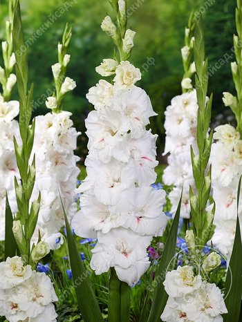 Гладиогус Декадент (Gladiolus Decadent) Высота растения 80-110 см. Цветы белые с тонкими пурпурными лучами на нижних лепестках. Крупноцветковый.