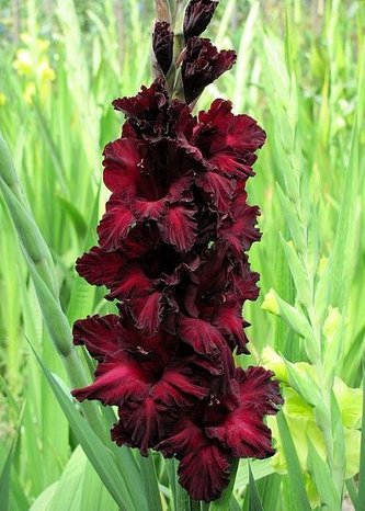 "Гладиолус крупноцветковый Блек Стар (Black Star) Высота растения 80-120 см. Цветки бархатные, вишневой окраски с черным краем. Продолжительность цветения 3-4 недели. Месторасположение: хорошо освещенные, защищенные от ветра участки."