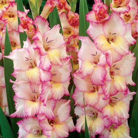 Сорт гладиолуса с трехцветными цветками. У них белые гофрированные цветки с розовыми краями и мягкое желтое горло. Соцветия расположены на крепких и прямостоячих кистях, украшенных заостренными мечевидными листьями.