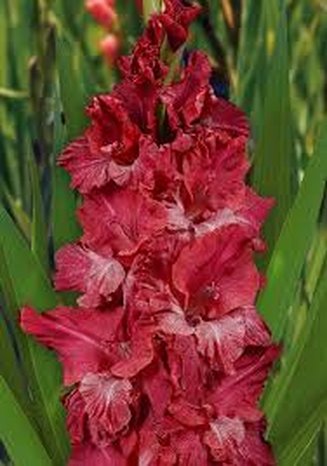 Старик Хоттабыч - высота растения 140 см. Цветки малиново-вишнёвые с густым муаровым рисунком на нижних лепестках. Срок цветения средний. Размер цветка более 14 см. Колос плотный, туго набитый. Одновременно открыто 9 фантастических цветов.
