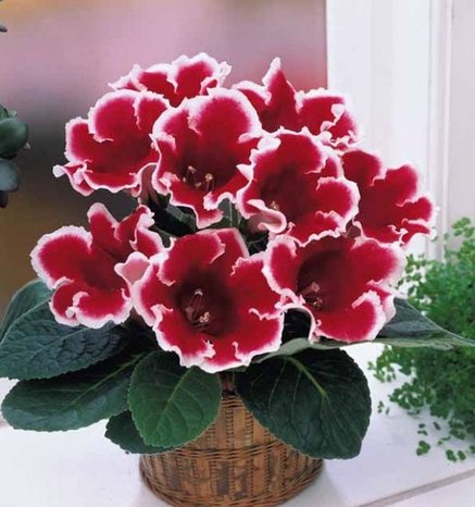многолетнее клубневое растение, выращивается как комнатное. Цветки крупные, малиново-красные с белым краем, широко-открытой колокольчатой формы, с простым околоцветником, в полном роспуске достигают диаметра 8-10см. Высота 15-20 см.
