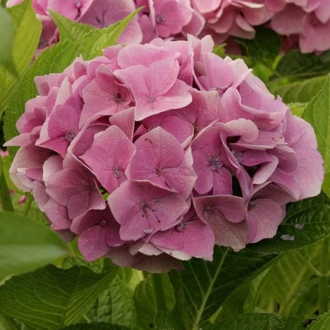 Саженцы гортензии крупнолистной Энконг (Hydrangea macrophylla Ankong) нежный, декоративный сорт, популярный среди новичков в садоводстве благодаря неприхотливости в уходе. Куст достигает в высоту и ширину 90-100 сантиметров. Куст плотный, ветви сильные. Листья очень красивые – интенсивный зеленый с прожилками. Период цветения – июль-сентябрь. Соцветия – большие, плотные, состоящие из небольших цветочков розово-лилового оттенка.