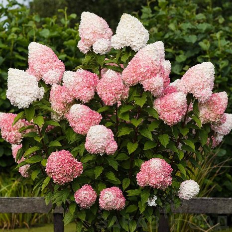 Гортензия Пинк энд Роуз (Розовый и Роза) метельчатая - Куст высотой 130 см и диаметром 120 см с сильными, не поникающими ветвями и крупными соцветиями широкопирамидальной формы. Цветки в течение сезона изменяют свою окраску от белой до розовой, к концу сезона становясь малиновыми