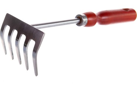 Рабочая часть изготовлена из высококачественной нержавеющей стали. Деревянная рукоятка отполирована, покрыта лаком, имеет отверстие для удобства хранения. Ширина рабочей части 86мм. Применяется для аэрирования почвы и сбора опавшей листвы в саду и огороде.