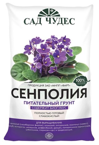 Особенно эффективен для выращивания: сенполий (узамбарских фиалок), алоказий, антуриумов, кампанул (невест), аукуб, аспидистр, циперусов, диффенбахий, драцен, папоротников (адиантумов, циботиумов, птерисов и др.) и традесканций. Продукт изготовлен на основе торфов различной степени разложения с добавлением органических субстратов, природных структурирующих компонентов, макро- и микроэлементов. Рыхлый грунт с повышенным содержанием агроперлита, среднеобеспеченный элементами питания. Повышает всхожесть семян и приживаемость растений, улучшает их декоративные качества. Содержание основных питательных элементов, мг/л, не менее: азот — 120, фосфор — 120, калий — 280 рН — 5,5-6,5