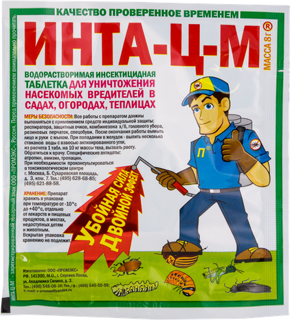 Спектр действия: белокрылка, тля, трипсы, плодожорка, листовертка, яблоневый цветоед, клещи, ростковая муха, колорадский жук, малинно-земляничный долгоносик и т.д.