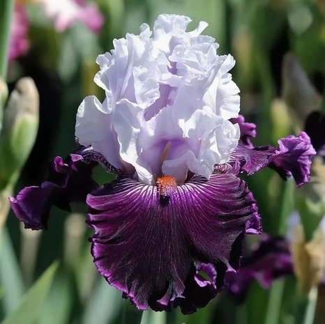Хорошо зимующее многолетнее корневищное растение с мечевидными линейными прикорневыми листьями, собранными в вееровидные пучки. Высота растения 70-90см. Цветок крупный, верхние лепестки фиолетово-голубые с розоватым оттенком, нижние — темно-фиолетовые. Бородка желтая. Рекомендуется посадка на хорошо освещенных месах или с частично затененныхм во второй половине дня, защищенных от ветра участки. На одном месте могут расти до 7-8 лет.