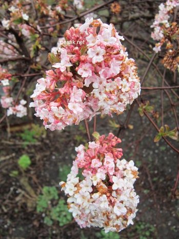 Декоративный, неприхотливый, медленнорастущий, листопадный кустарник. Куст прямостоячий, молодые побеги вертикальные, слабо разветвляются, старые побеги скручены дугообразно, образуя раскидистую шарообразную крону.Лист зеленый, ароматный, осенью красно-темно-фиолетовый, супротивный, продолговато-эллиптический, ланцетный 6-9 см, черенок красный. Бутон ярко-розовый, цветок бело-розовый, с сильным ароматом, расположены на конце побега в щитковидном соцветии.