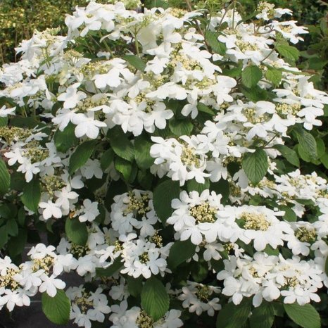 кустарник высотой до 2 м и шириной до 2-3 м, с широкой кроной и ветвями, расположенными горизонтальными каскадами. Листья тёмно-зелёные, осенью красно-пурпурные, с глубокими, очень декоративными жилками. Цветёт большими белым цветками, собранными в горизонтальные соцветия диаметром 8-10 см. Плоды красного цвета, декоративны.