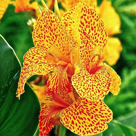 Высота растения до 70-90 см. Листья зеленой окраски. Цветки ярко-желтые с красным крапом.