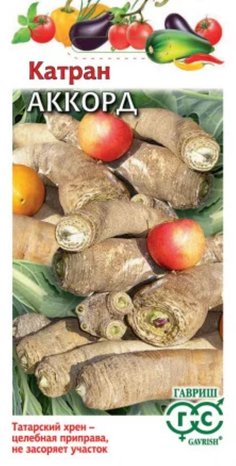 Двух-трехлетняя культура, выращиваемая как улучшенный аналог хрена. Корни катрана богаче по химическому составу и вкусовым качествам, а также более технологичны при переработке (корешок не ветвится). Сорт рекомендован для использования в свежем и переработанном виде, как корней так и листьев. Розетка листьев полуприподнятая, хорошо облиственная. Лист крупного размера, нежный, сочный, без опушения. Корнеплод цилиндрический, прямой, гладкий , массой 150-250г. Мякоть белая, плотная, со вкусом и ароматом как у хрена. Предпочитает хорошо структурированные, плодородные почвы. Средняя урожайность – 3,9 кг/м2.