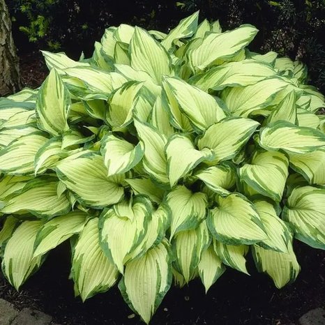Многолетник с эффектными, большими листьями, весной - кремово-жёлтыми, с зелёным краем. Летом листья зеленеют. Цветки бледно-фиолетовые, в длинных соцветиях, цветущих в июле. Поздно начинает вегетацию. Требует очень плодородной, перегнойной, постоянно влажной почвы. Подходит на рабатки, для покрытия больших поверхностей в тени.