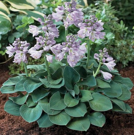 (Blue Mouse Ears) Высота куста 15-20см. Карликовая хоста с чашевидными овальными листьями темно-синего цвета, со слегка волнистыми краями. Цветы лавандовые с тёмно-фиолетовыми полосками.
