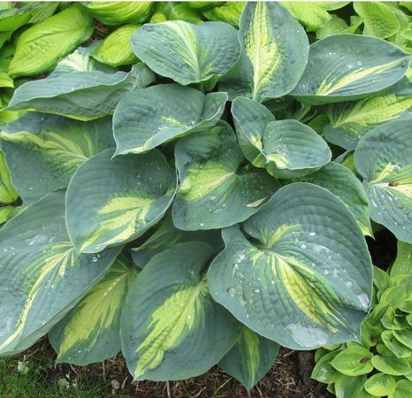 Хоста Дрим Квин (Dream Queen) Большая хоста. Высота растения более 80 см. Ширина куста до 80 см. Листья почти круглые, плотные, ребристые, зелено-синей окраски с кремово-белым центром. Цветки белые.