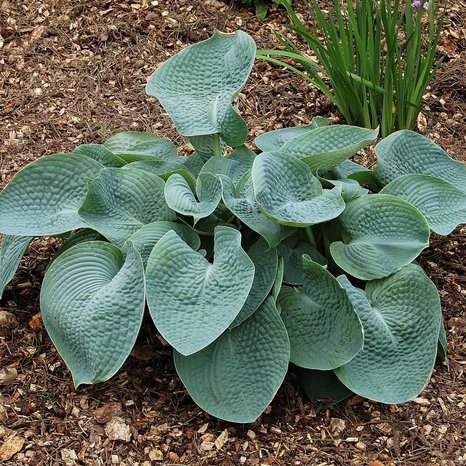 (Abiqua Drinking Gourd) Высота куста 30-50см, ширина – до 90см. Листья крупные (21х21см), кожистые, округлой, слегка чашевидной формы, оригинальной сине-зеленой окраски. Цветки почти белые, размером 2-3см, с лёгким лавандовым оттенком