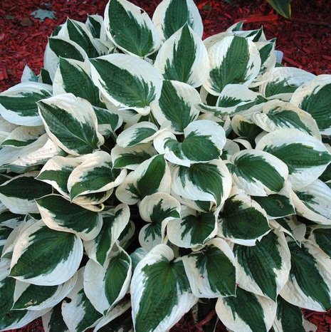 Темно-зеленые листья размером 16х13 см с широкой зубчатой белой каймой. Цветы лавандовые. Куст высотой 50 см. Сорт предпочитает открытые солнечные места.