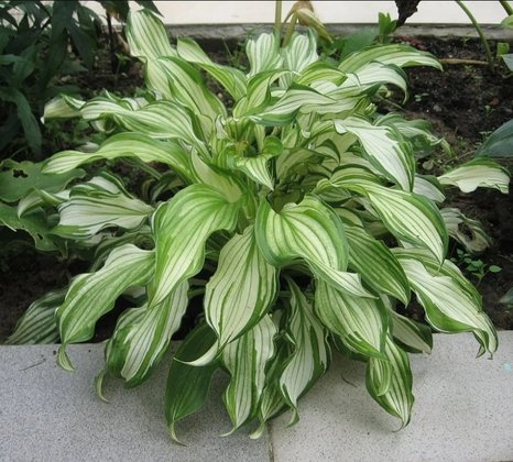 Хоста Твистед Спирминт (Hosta Twisted Spearmint) Высокодекоративная хоста среднего размера, высотой 35-40 см и шириной 50-60 см. Листья удлиненные, сильно изгибающиеся, плотные, белые с неравномерно-зелёными волнистыми краями. Цветки лавандовые.